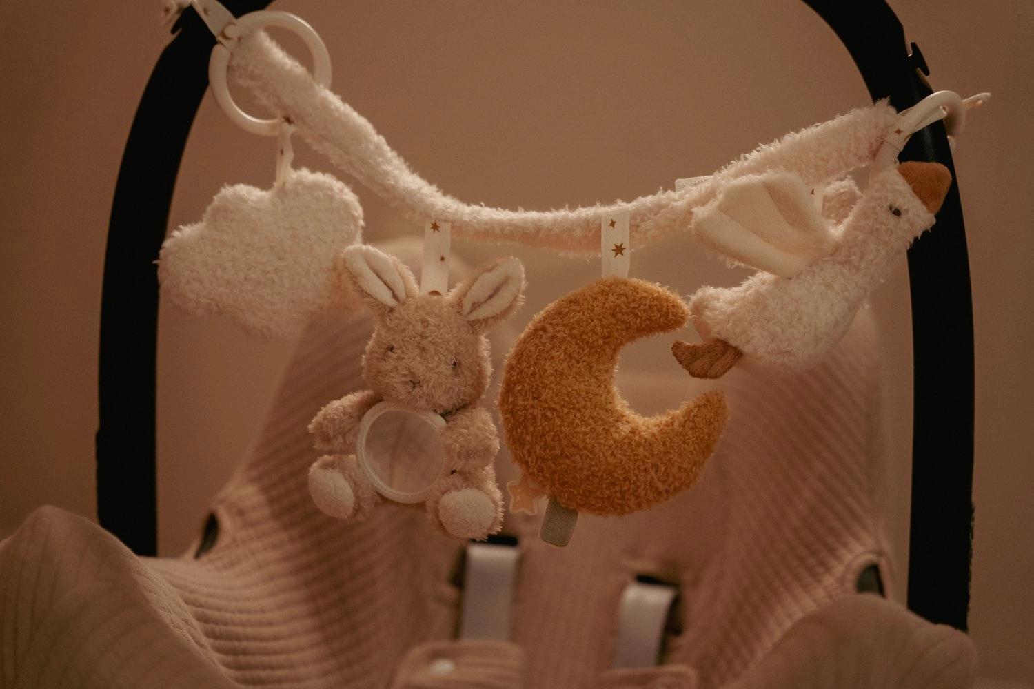 Забавен спътник по време на всяка разходка! Активната играчка за количка Newborn Naturals носи радост с меките си фигурки и нежния дрънчащ звук. Лесна за прикрепване към количката, за да има бебето винаги нещо интересно за гледане и опознаване. Изработена от меки материали в успокояващи цветове – идеална за малките ръчички.