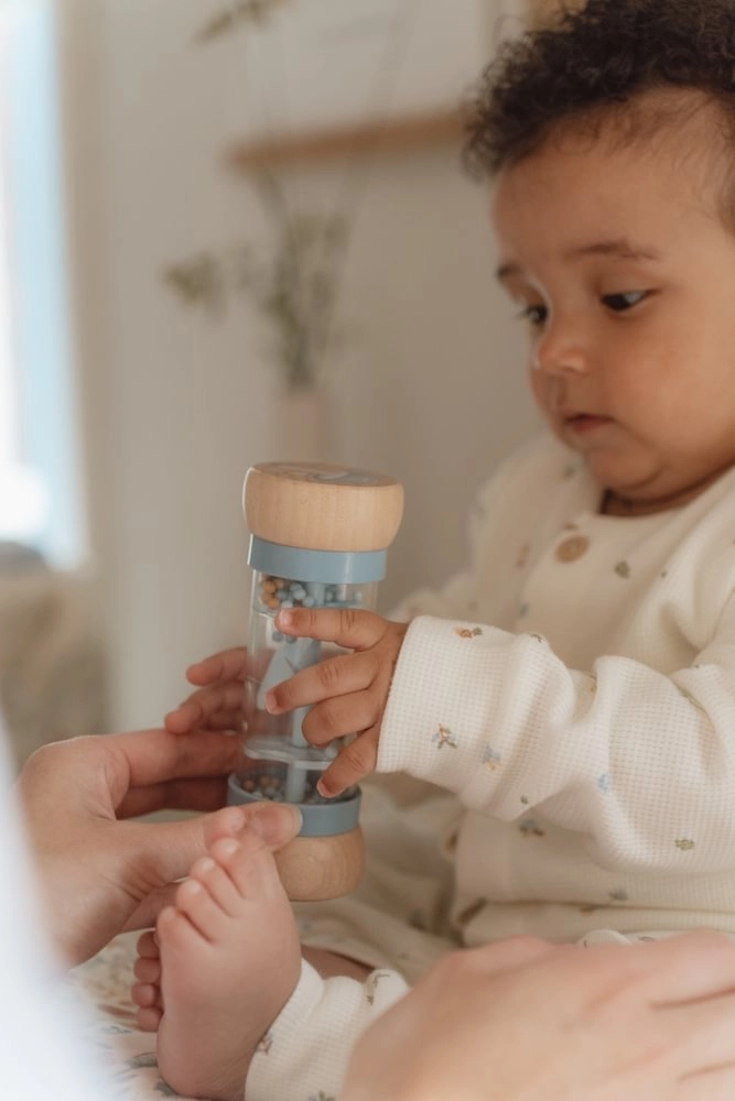 Дрънкалката е удобна за хващане от малките бебешки ръчички. Лесно се търкаля и топчетата вътре издават деликатен звук.