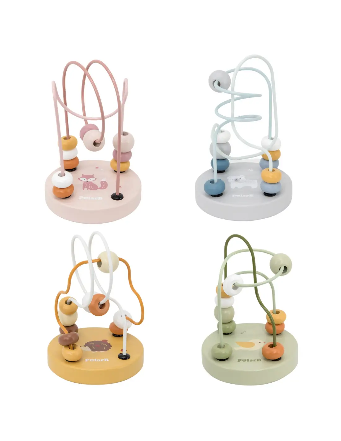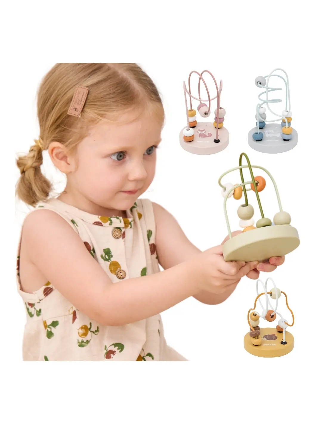 На дървената основа ще откриете весела картинка с животни, към която са прикрепени цветните спирали. Двете форми на мънистата и техните ярки цветове със сигурност ще привлекат вниманието на вашето дете. Всяка играчка се предлага в различни цветове на спиралите и основите, като се избира на случаен принцип, което добавя елемент на изненада.