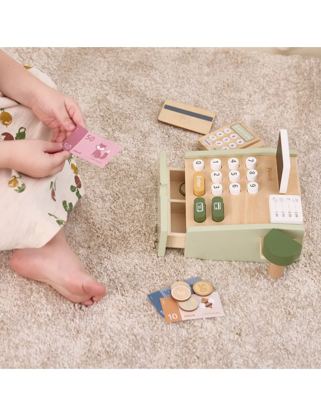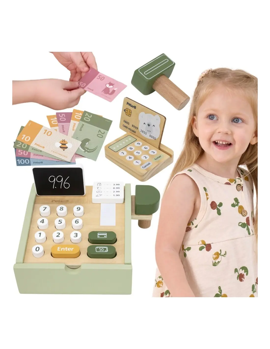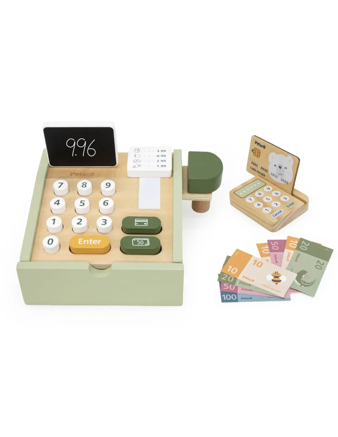 Представете си, че имате собствен малък магазин. Сканирайте продуктите и натиснете малките бутони, за да извадите общата сума. Искате ли да платите в брой или с карта? Този дървен касов апарат се предлага както с пос терминал, така и с монети и банкноти, които могат да се съхраняват в чекмеджето за пари. Всичко, от което се нуждаете, за да играете на пазар с вашите родители, приятели или любима кукла. Детският касов апарат е не само страхотен за ролева игра, но също така помага за развитието на математическите, двигателните и социалните умения на вашето дете.