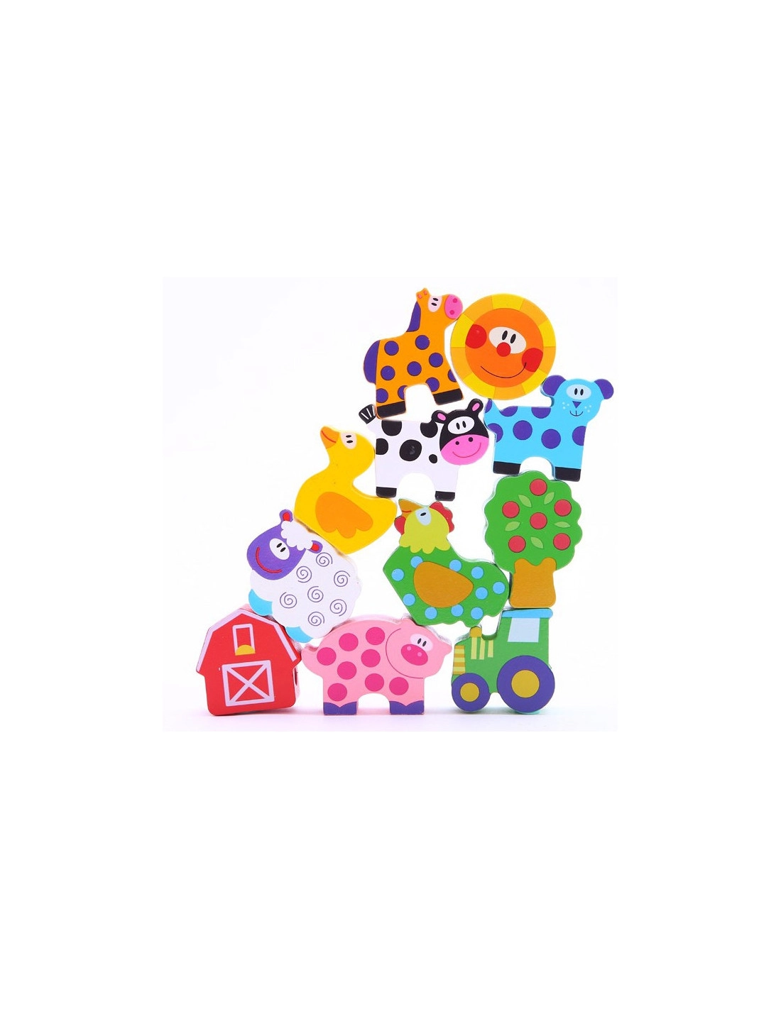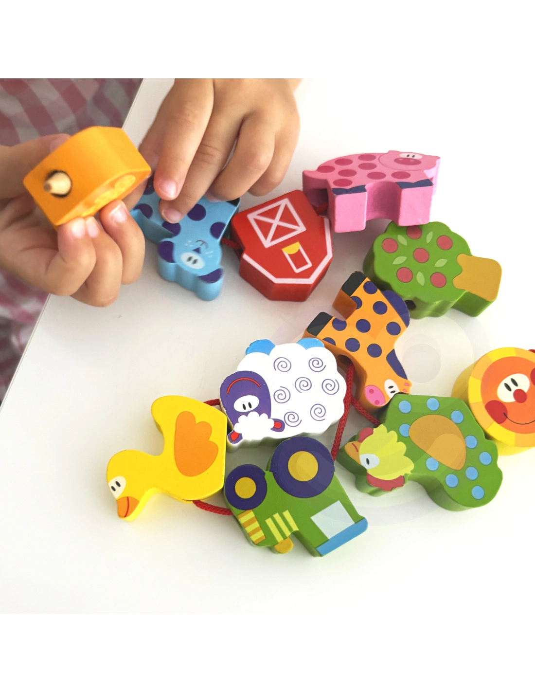 Kомплектa включва дървени мъниста с форми на животни с дупки, през които детето прoмушва връв и удобна кутия с капак за съхранение. Това е страхотно забавление, което развива сръчността и концентрацията и в същото време запознава детето с различните животни.