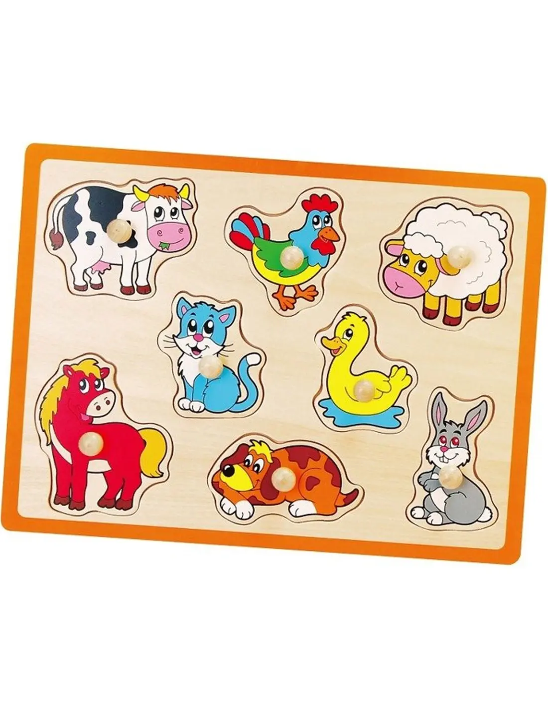 Дървеният пъзел с дръжки от Viga Toys за деца от 12 месеца е идеалното решение за дома и детската градина. Състои се от дъска и 8 елемента с животни, които трябва да се поставят във вдлъбнатите форми. Върху дървената основа има вдлъбнатини, които по своята форма отговарят на цветни пъзели. Всяка част има малка дръжка за по-удобно хващане и поставяне. Благодарение на играчката детето развива координацията око-ръка и опознава заобикалящия свят в съответствие с принципите на Монтесори. По време на игра детето ще научи и имената на различните геометрични форми.