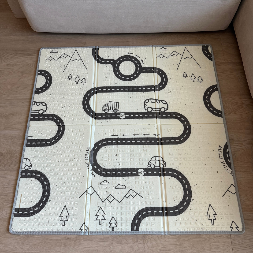 Едната страна е оформена с път и автомобили, които превръщат пода в малък град за игра — децата могат да карат колички, да измислят маршрути и да развиват координацията си.