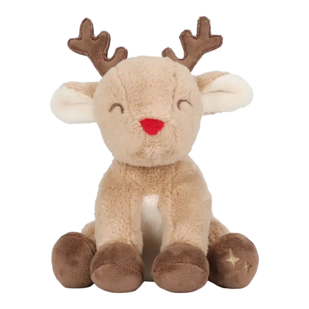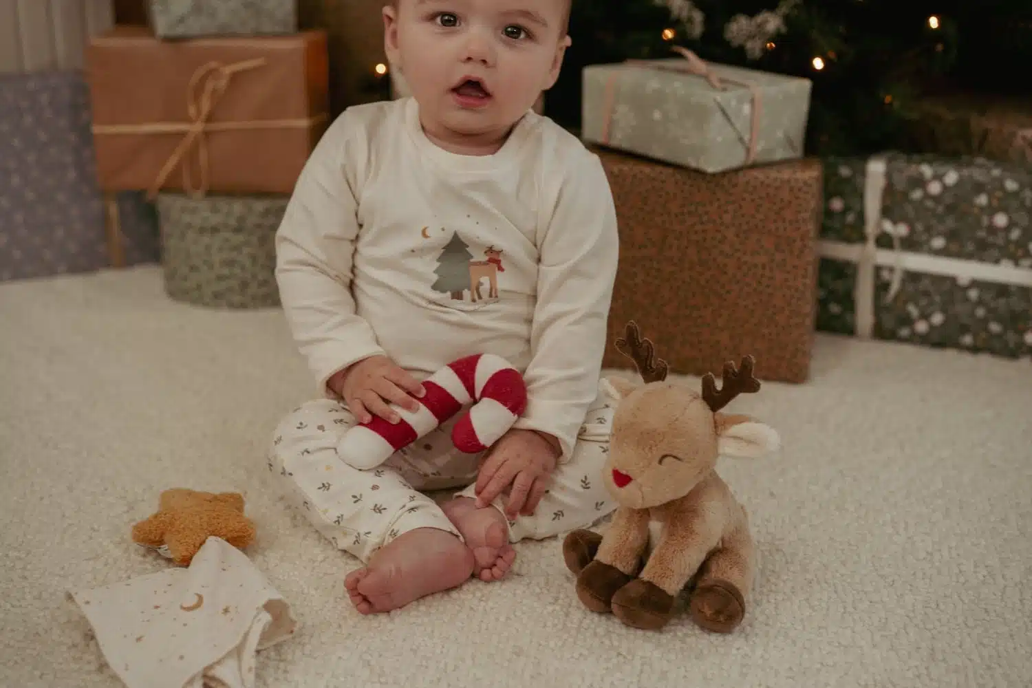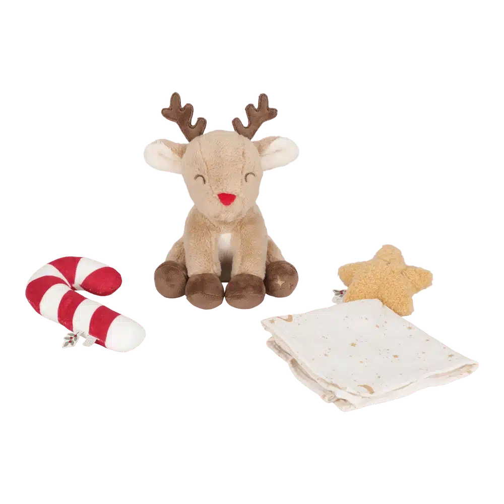 Кутията включва 3 любими меки играчки с коледна тематика за гушкане и игра – Меко муселиново дуду одеялце за гушкане с мека звезда, плюшено коледно еленче и мек коледно бастунче.