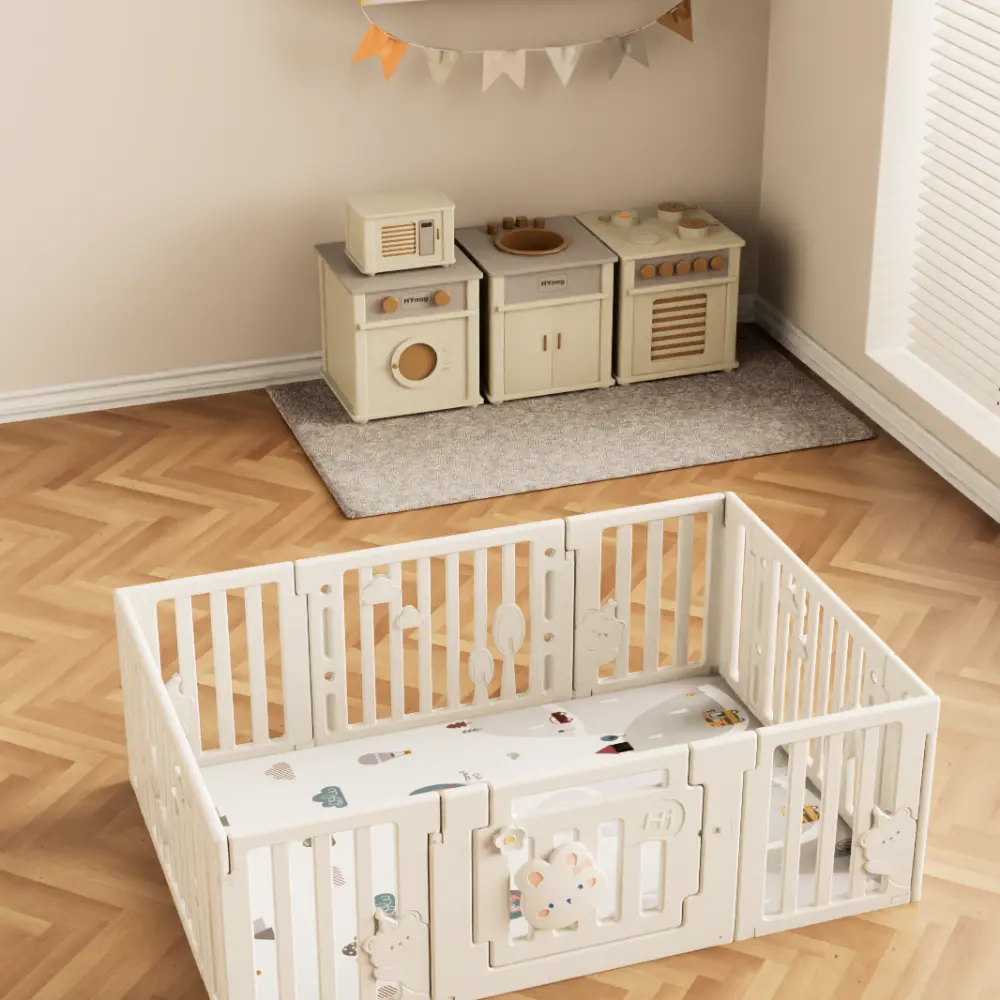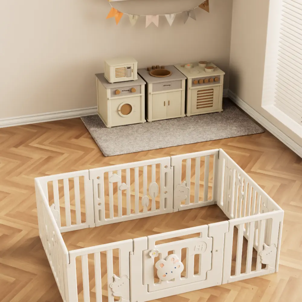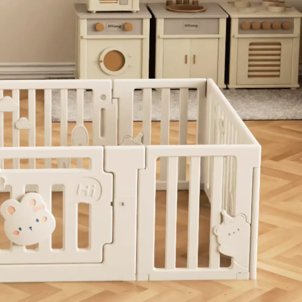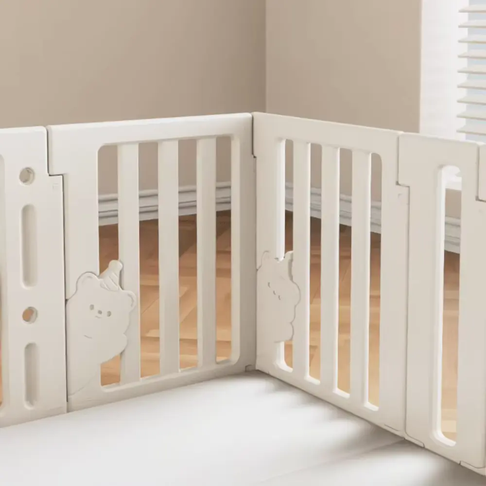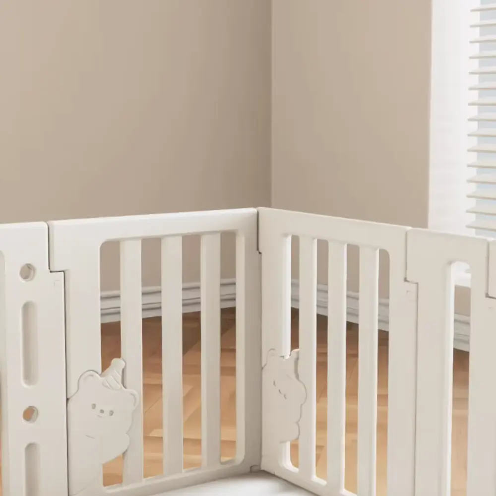 Изработена от здрава и безопасна пластмаса, с гладки ръбове и пастелни цветове, оградата е стабилна и удобна за