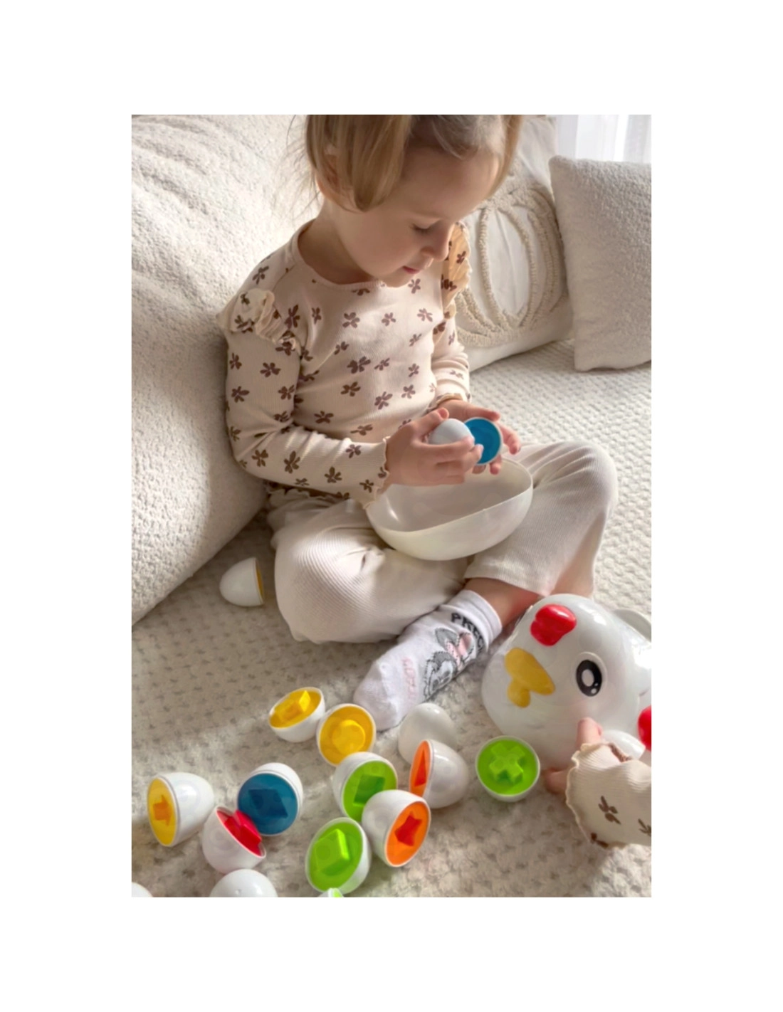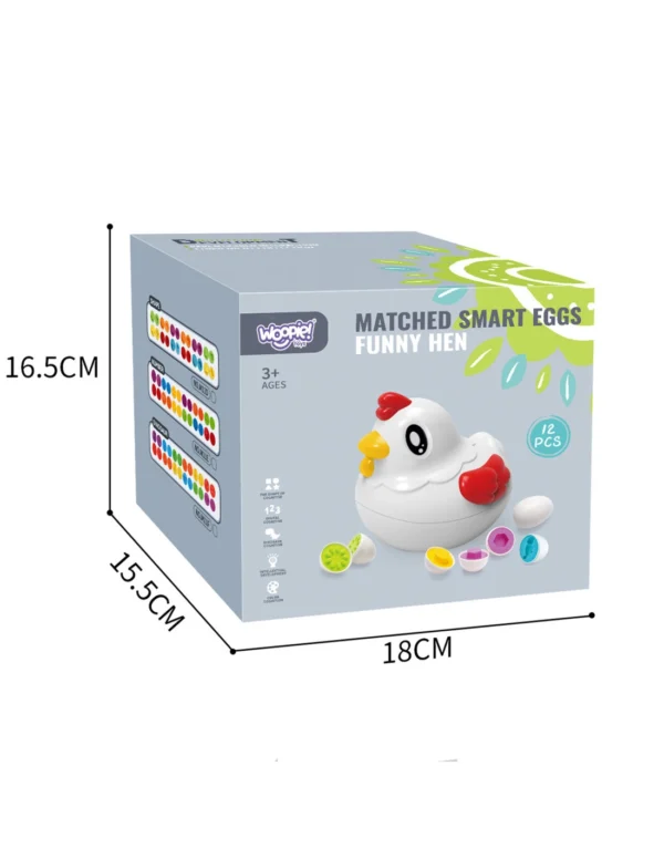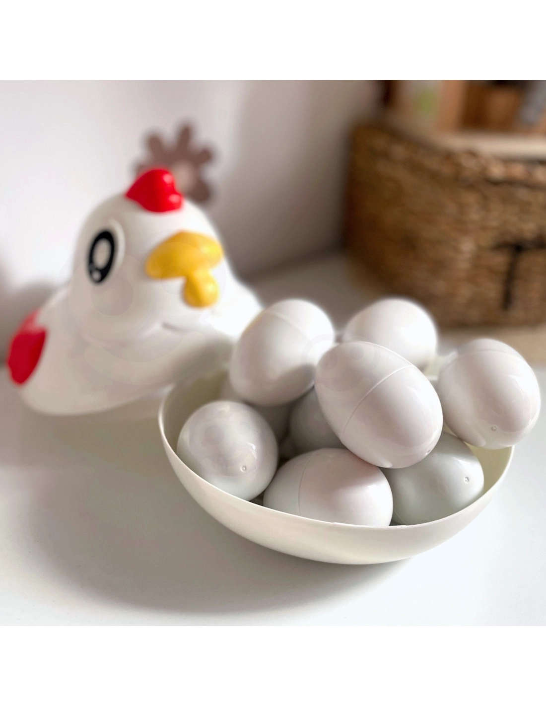 Комплектът се състои от 12 броя яйца с различни цветове и форми за напасване и забавна кутия за съхранение във формата на кокошка.