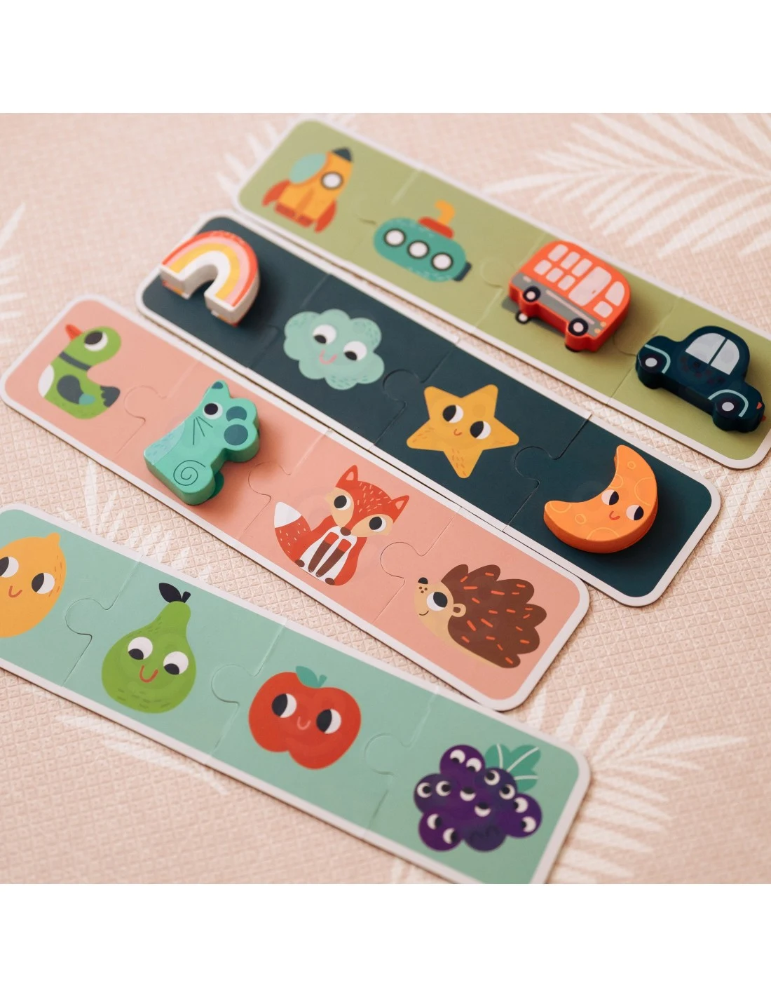 Комплекта включва 16 дървени елемента с различни форми, 16 картонени елемента с картинки, платнена торбичка за съхранение.