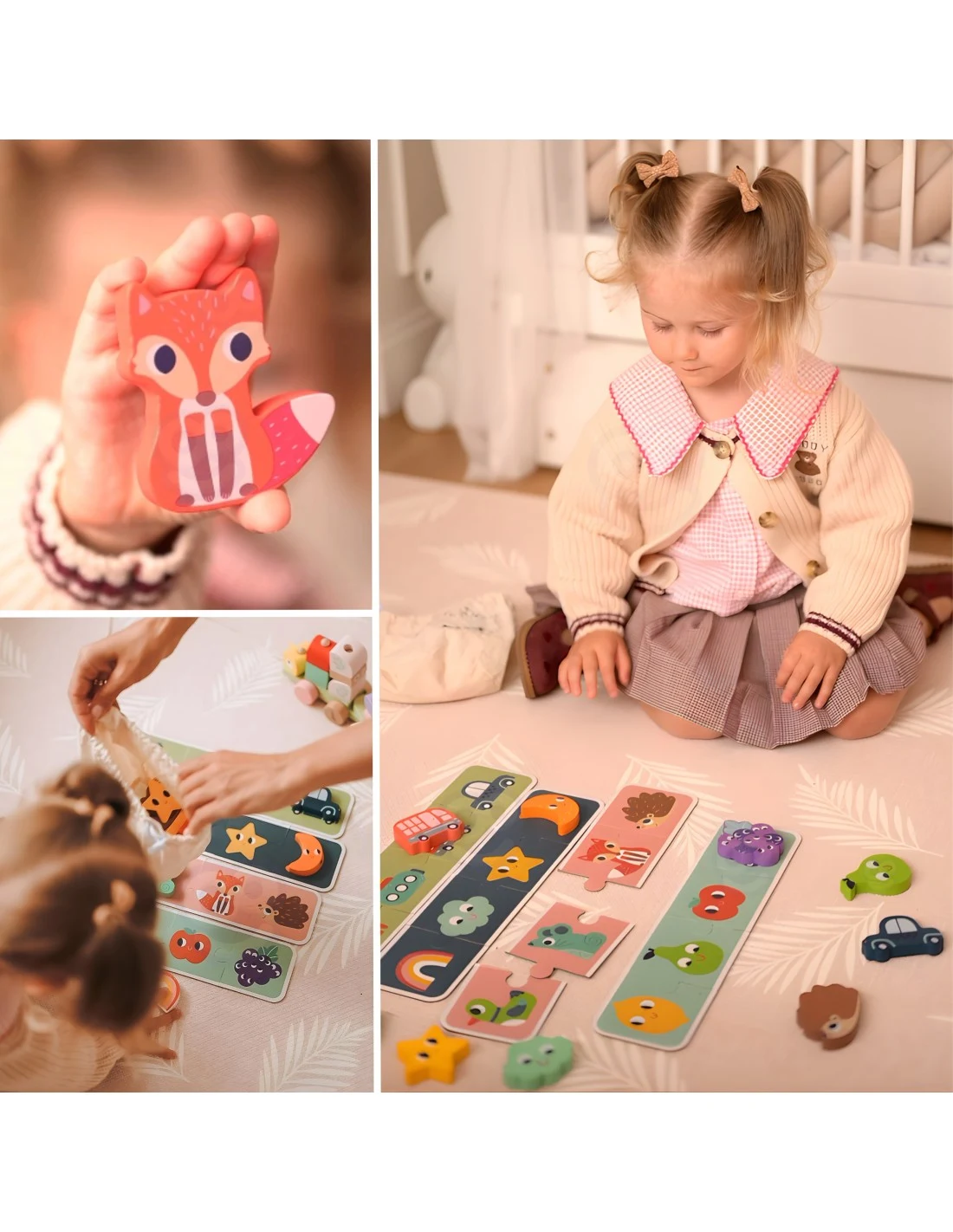 – Комплектът съдържа 33 части – 16 дървени блокчета, 16 пъзела с картинки и платнена торбичка