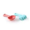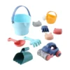 Комплектът включва 7 елемента: кофичка, лейка, 4 формички, малка и голяма лопатка, гребло и кола с валяк. Кофата и лейката са с удобни дръжки за носене.