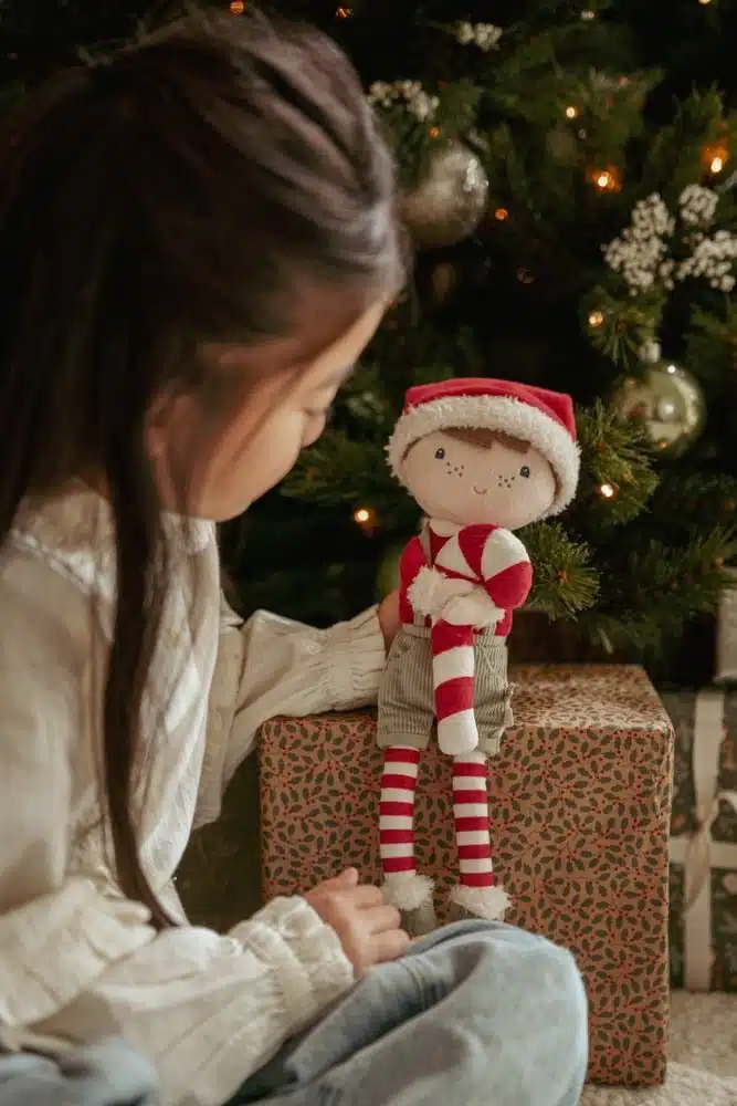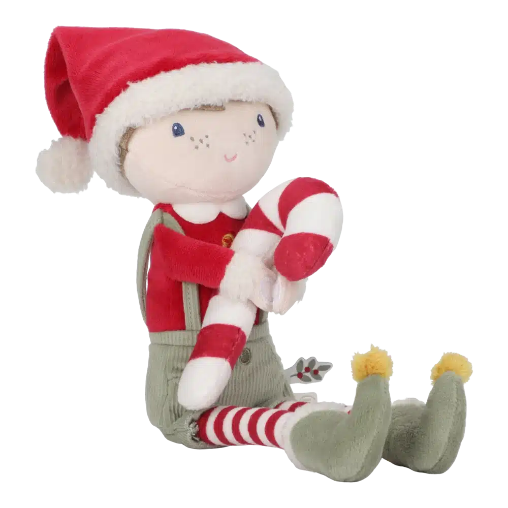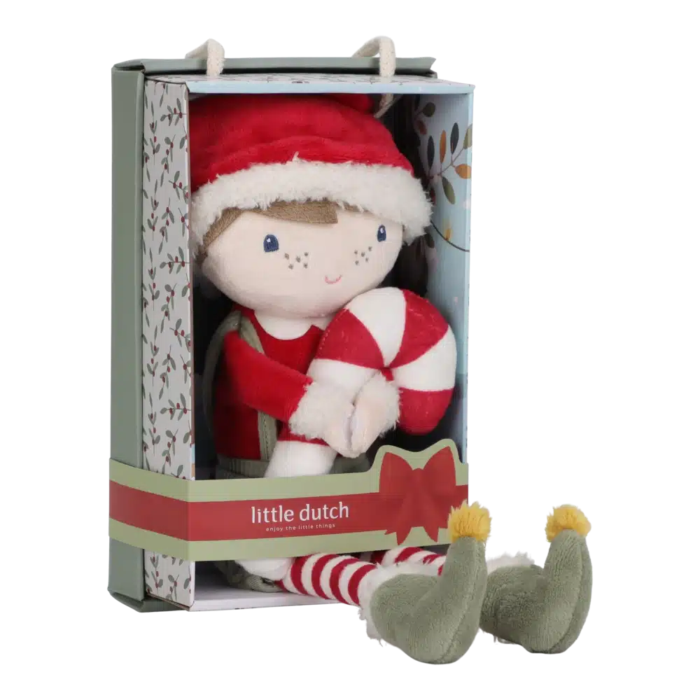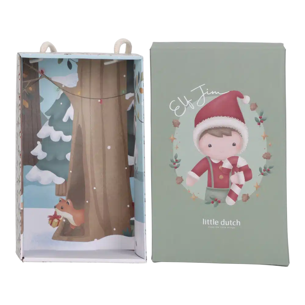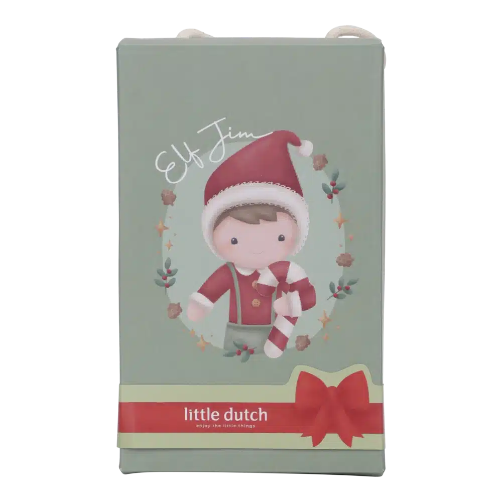 Запознайте се с прекрасния коледен елф Джим. Тази плюшена кукла за момчета е с червена коледна шапка и зелени ботуши с понпони и няма търпение да бъде гушкана. Джим е готов да прекара коледните празници с теб. Със своите велкро ръчички стиска задраво коледно захарно бастунче и няма търпение да празнува. Джим е мек и пухкав, висок 35 см и се предлага в красива подаръчна кутия – перфектен Коледен подарък!