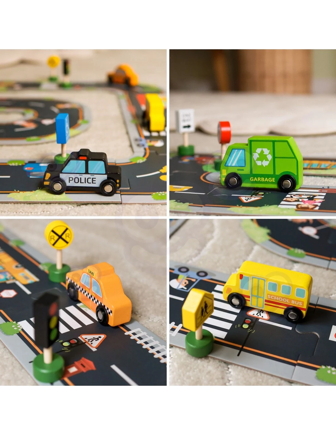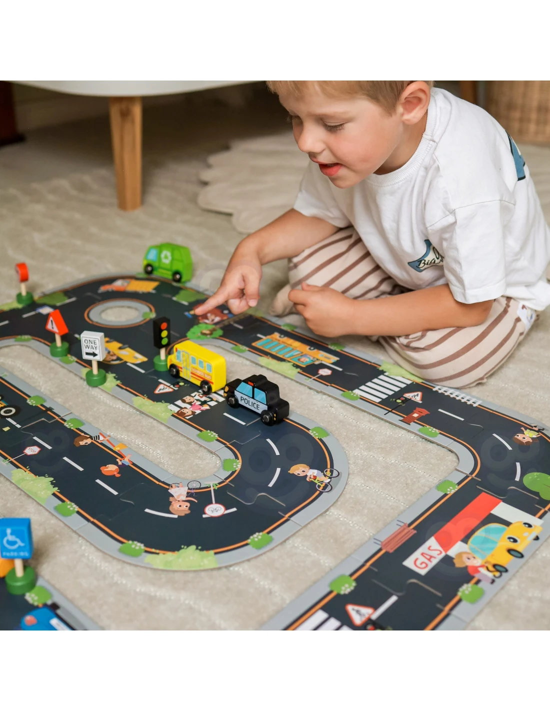 Сглобяването на пъзел е възможност за децата да играят свободно, като същевременно развиват фина моторика, координация око-ръка и умения за концентрация. Освен това, пъзелите изобразяват пътни знаци, улици и градски модели на движение – децата учат за света около тях, изучавайки правила за безопасност и управление на движението.