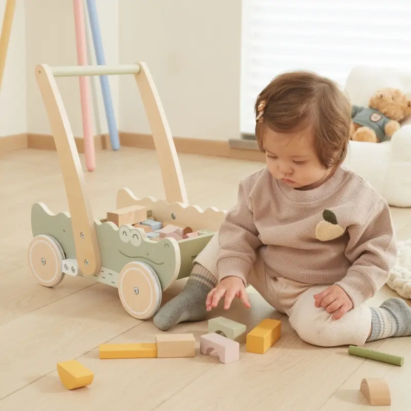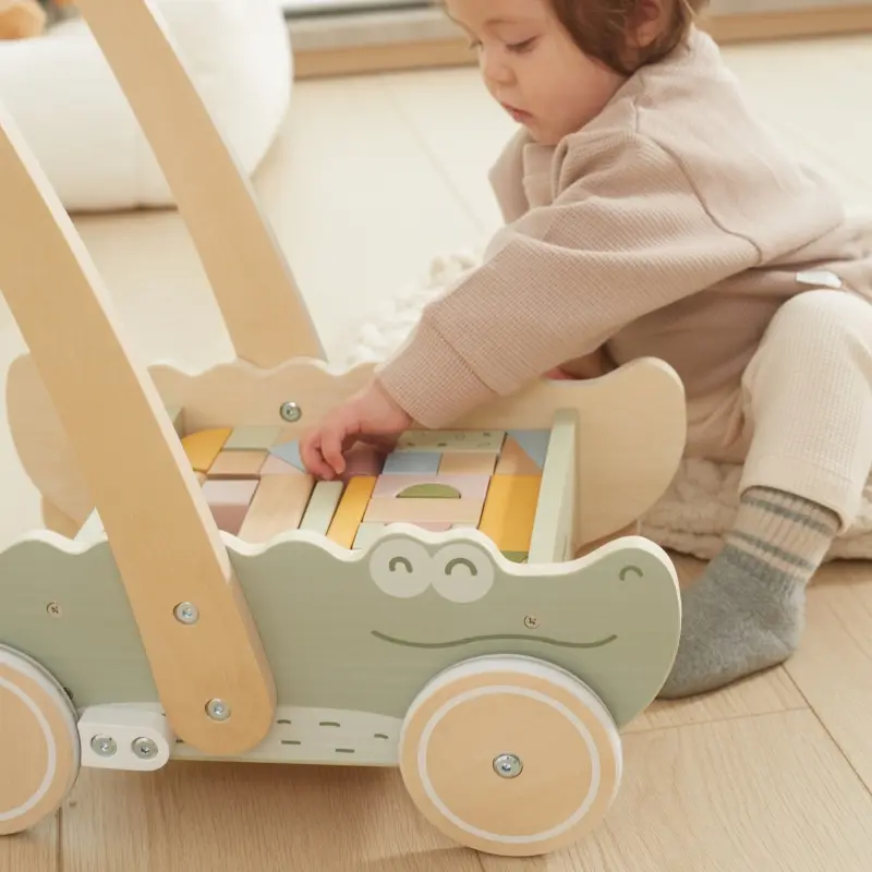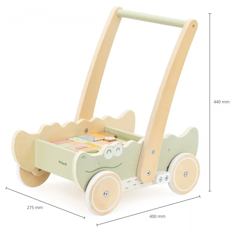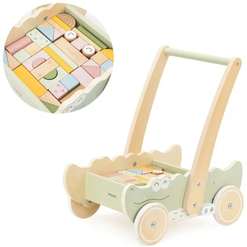 Открийте радостта от първите крачки с нашата очарователна дървена проходилка-играчка за бутане във формата на крокодил! Тази многофункционална играчка е идеалният спътник в развитието на вашето малко дете. Нейната стабилна конструкция и удобна дръжка осигуряват сигурна подкрепа по време на ученето на ходене. Комплектът включва и набор от цветни кубчета, които насърчават творческата игра и развитието на фината моторика.