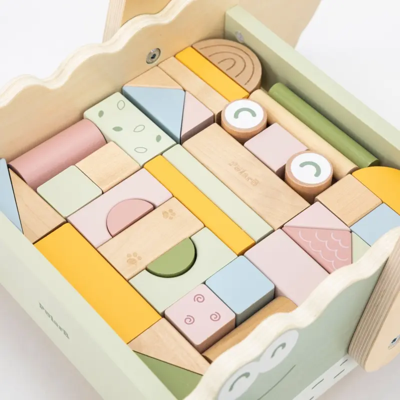 - **Включени цветни кубчета:** Разнообразни форми и пастелни цветове, които насърчават креативната игра.